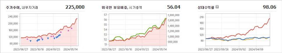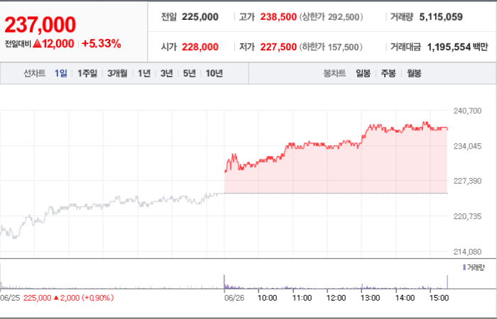 SK하이닉스 주가가 225,000원으로 형성되었으며 전일 대비 안정적인 모습을 보이고 있습니다. 주주 중 에스케이스퀘어(외 8인)이 20.07%의 지분을 보유하고 있습니다. SK하이닉스는 반도체 및 관련 장비 기업으로, 현재 주가는 225,000원이며 시가 총액은 172조5366억 원에 발행 주식수는 728,002,365주입니다. 외국인 보유 비중은 56.04%이며 장중 거래량은 5,730,999주를 기록했습니다. 또한, 매출액은 124,296억 원을 달성했습니다.