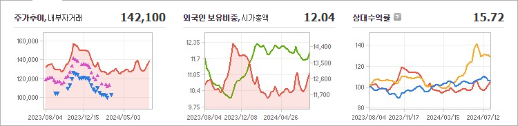 롯데칠성의 현재 주가는 142,100원으로, 전날보다 100원이 하락한 상태입니다. 주주 현황을 보면, 롯데지주와 그 외 16명이 총 62.40%의 지분을 보유하고 있습니다. 롯데칠성은 음료 산업에 속하는 기업으로, 현재 장중 기준 주가는 142,100원입니다. 이 회사의 시가총액은 1조3,185억 원이며, 총 발행 주식 수는 9,278,884주입니다. 외국인 투자자의 보유 비율은 12.04%이며, 장중 거래량은 63,359주에 달했습니다. 롯데칠성의 매출액은 9,369억 원에 이릅니다.