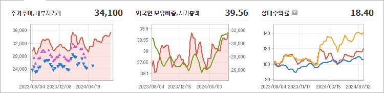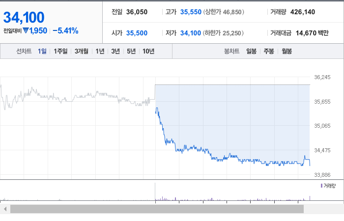 현대해상의 현재 주가는 34,100원으로, 전일 대비 1,950원이 하락한 상태입니다. 주주 현황을 살펴보면 정몽윤을 포함한 4인이 총 22.85%의 지분을 보유하고 있습니다. 보험업체인 현대해상의 주가는 장중에 34,100원을 기록하고 있으며, 시가총액은 약 3조 485억 원에 달하고, 발행 주식 수는 89,400,000주입니다. 외국인 보유 비율은 39.56%이며, 장중 거래량은 426,283주에 이릅니다. 현대해상의 매출액은 43,420억 원을 기록했습니다.