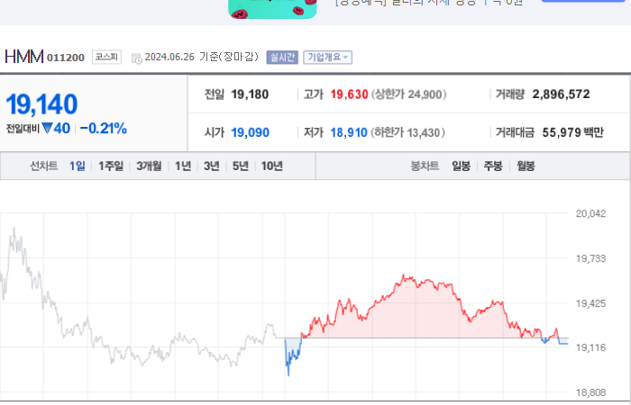 HMM 주가는 현재 19,180원이며 전일 대비 -5.05원 하락하고 있습니다. HMM 주주들은 회사의 29.79%를 소유하고 있습니다. HMM은 해상운송 기업으로, 시장에서의 주가는 19,180원입니다. 회사의 시가 총액은 13조5710억 원이며 발행 주식수는 749,039,496주입니다. 외국인 보유 비중은 10.57%이고, 거래량은 7,331,023주입니다. 또한 매출액은 23,299억 원을 기록했습니다.