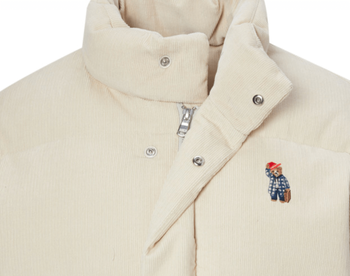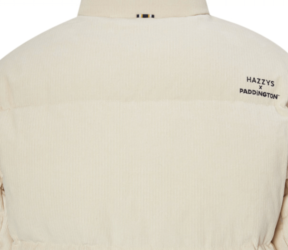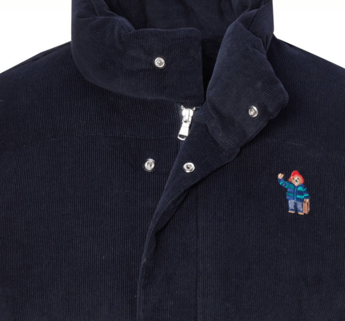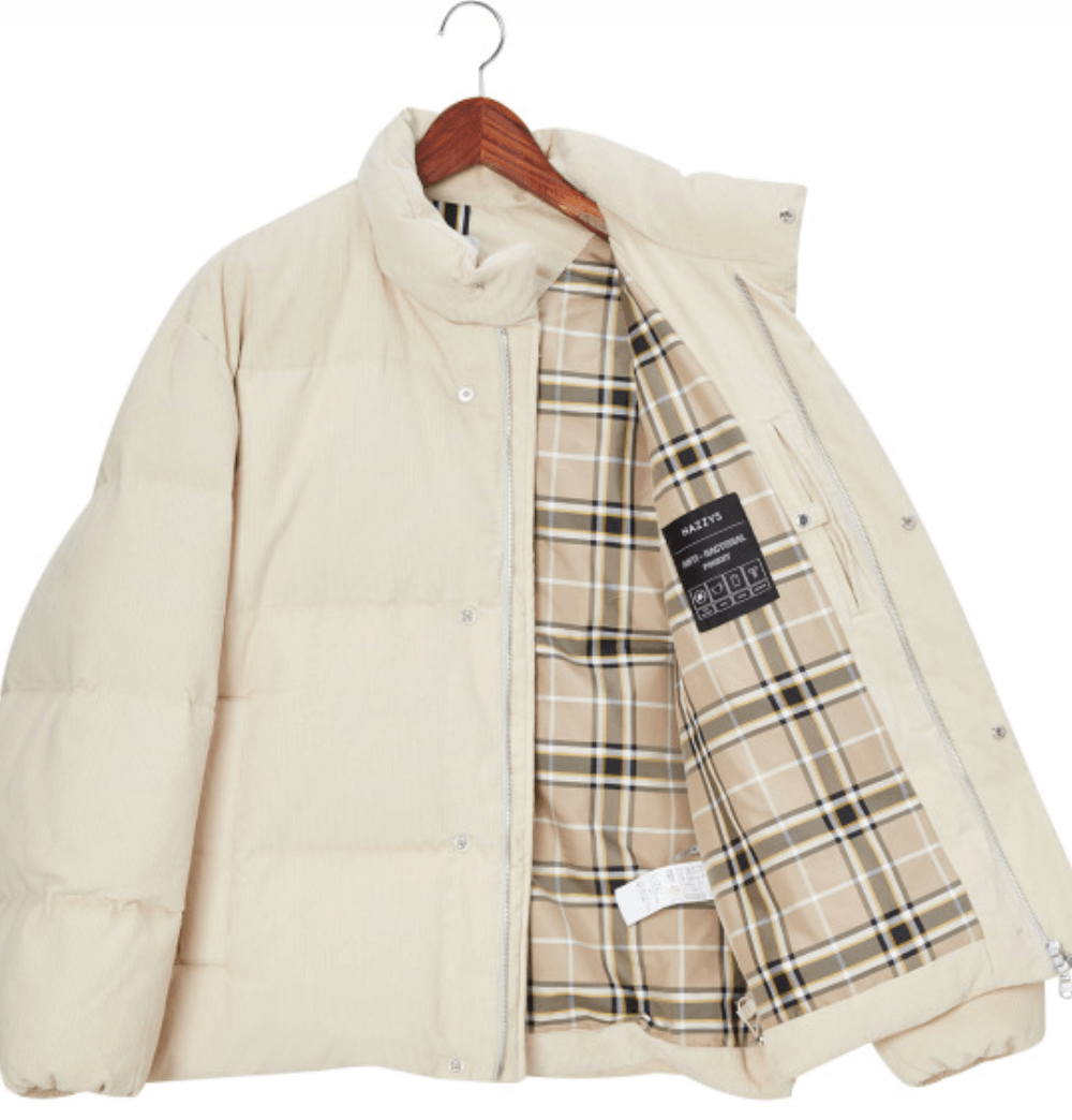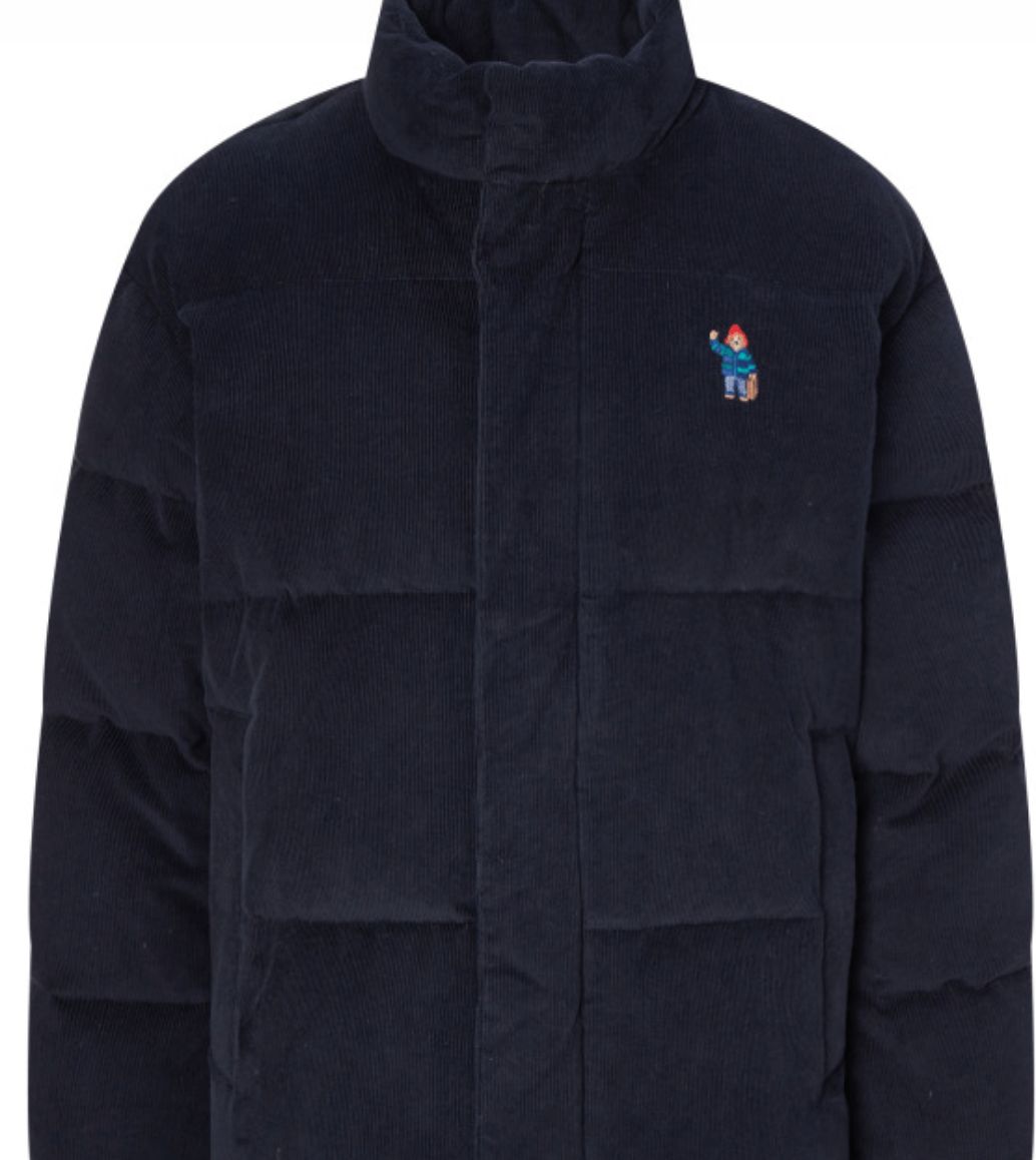 첫 번째로 추천드리는 제품은 '패딩턴 네이비 캐릭터자수 구스다운 패딩점퍼'입니다. 코듀로이 재질이 사용되었으며 캐릭터 자수가 귀여우면서 캐주얼함을 극대화시킨 포인트입니다. 부드러운 면과 구스다운이 조화를 이루어 따뜻함은 물론이고, 일상에 편안함을 안겨줍니다. 해당 제품의 판매가는 현재 33만 원이며, 코드는 'HZJU2D752N3'입니다.