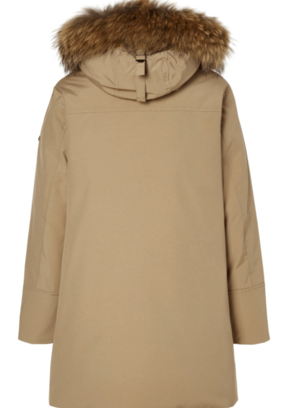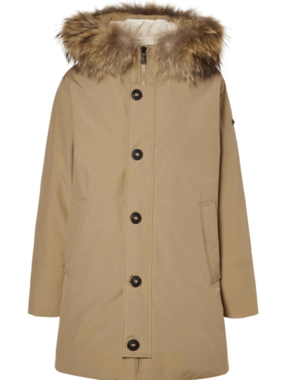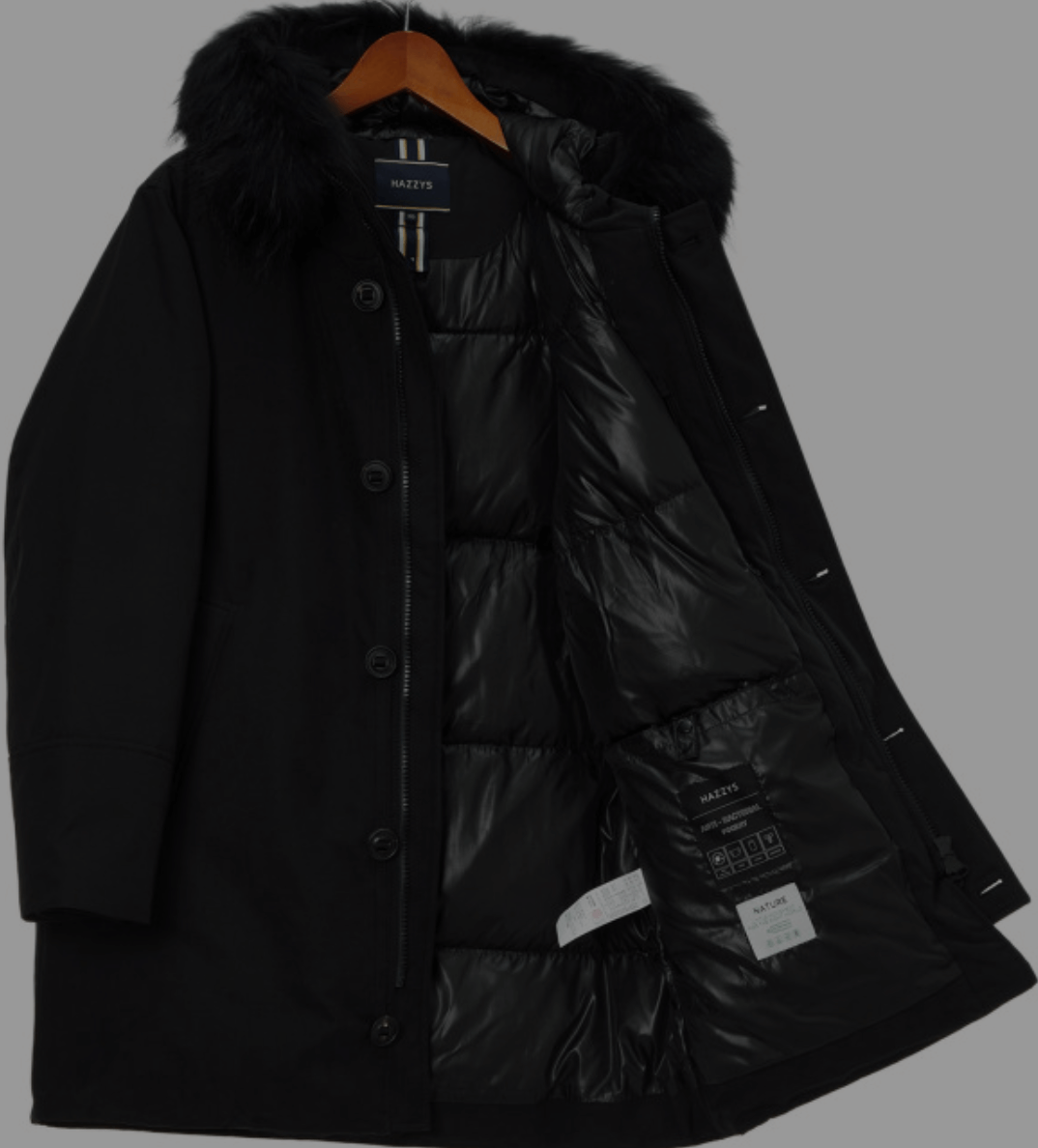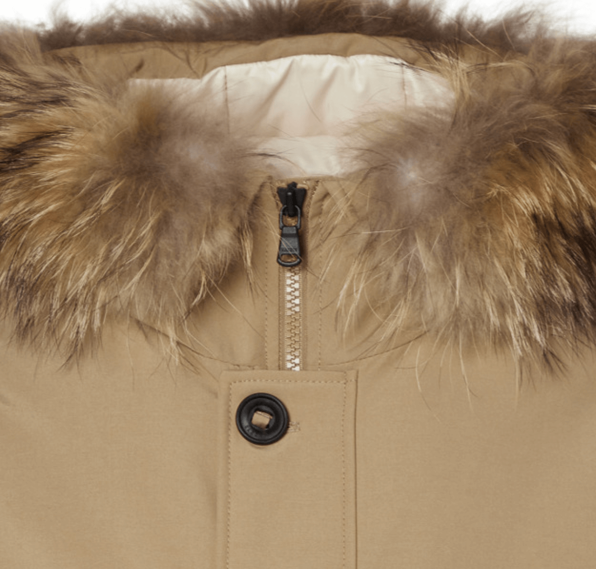 두 번째 인기 아우터는 라쿤퍼 구스다운입니다. 심플한 컬러가 출시되어 브라운과 블랙 색상이 있습니다. 후드 부분의 퍼는 탈부착이 가능하여 다양한 룩을 연출할 수 있고, 구스 다운 충전재가 추운 겨울을 나게 할 수 있는 훌륭한 기능을 소화합니다. 해당 제품의 가격은 55만 원이며, 상품 코드는 'HZJU2D899I2'입니다.