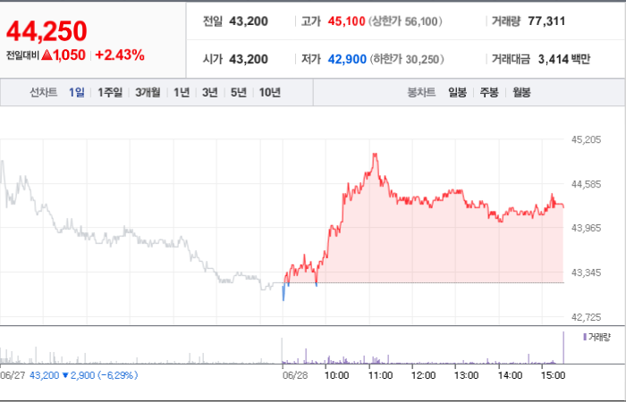 현대엘리베이의 현재 주가는 44,250원으로 전일 대비 -0.23원 하락했습니다. 주주 구성을 살펴보면 현대홀딩스컴퍼니(외 17인)가 지분의 27.75%를 보유하고 있습니다. 이 회사는 기계 제조업체로, 시가 총액은 1조7298억 원이며 발행 주식수는 39,092,385주입니다. 외국인 보유 비중은 26.45%이며 장중 거래량은 77,409주를 기록했습니다. 또한 매출액은 6,613억 원을 기록했습니다.
