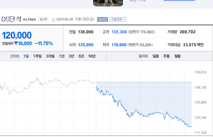 DS단석의 현재 주가는 120,000원이며 전일 대비 -16,000원 하락했습니다. DS단석의 대주주 한승욱(외 3인)은 지분 40.64%를 소유하고 있습니다. 이 회사는 화학 기업으로 시가 총액은 7034억 원이며 발행 주식수는 5,861,404주입니다. 외국인 보유 비중은 1.45%이며 장중 거래량은 274,248주를 기록했습니다. 또한, DS단석은 매출액으로 2,185억 원을 기록했습니다.