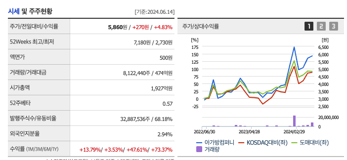아가방컴퍼니의 현재 주가는 5,850원이며 전일 대비 -10원의 하락세를 보이고 있습니다. 주주현황을 살펴보면, 이 회사의 지분 26.53%를 소유하고 있습니다. 아가방컴퍼니는 섬유 및 의복 기업으로, 장중 기준으로 주가는 5,820원입니다. 시가 총액은 1782억 원이고, 발행 주식수는 32,887,536주입니다. 외국인 보유 비중은 2.93%이며, 장중 거래량은 1,656,819주를 기록했습니다. 또한, 이 회사의 매출액은 450억 원을 달성했습니다.