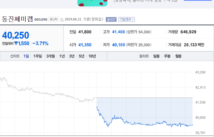 동진쎄미켐은 한국의 화학기업으로, 주로 화학제품 및 화학소재를 생산하고 판매하는 기업입니다. 주로 세라믹소재, 전자소재, 화장품 원료 등 다양한 산업 분야에 제품을 공급하고 있습니다. 회사는 고객 중심의 혁신적인 기술과 안정적인 품질을 바탕으로 글로벌 시장에서 경쟁력을 유지하고 있습니다. 동진쎄미켐은 지속가능한 발전을 추구하며 환경 친화적 제품을 개발하는 데도 힘쓰고 있습니다. 주식 시장에서는 안정적인 성과와 성장 가능성으로 투자자들의 관심을 끌고 있습니다.