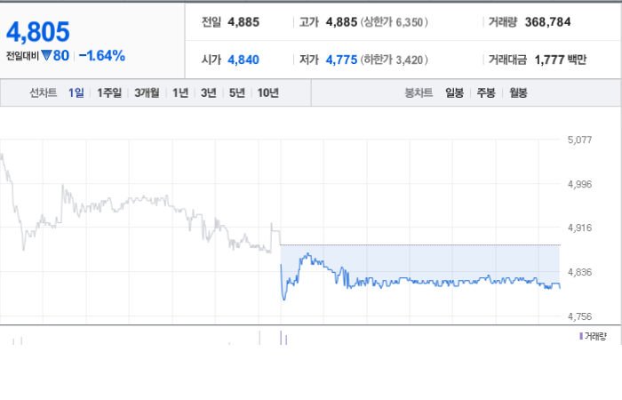 한일사료의 현재 주가는 4,805원이며 전일 대비 -80원 하락했습니다. 주주 구성을 살펴보면 차상협(외 6인)이 지분 43.68%를 보유하고 있습니다. 이 회사는 식료품 기업으로 분류되며 시가 총액은 1893억 원이고 발행 주식수는 39,403,685주입니다. 외국인 보유 비중은 0.94%이며 장중 거래량은 378,561주를 기록했습니다. 또한 매출액은 1,104억 원을 기록했습니다.