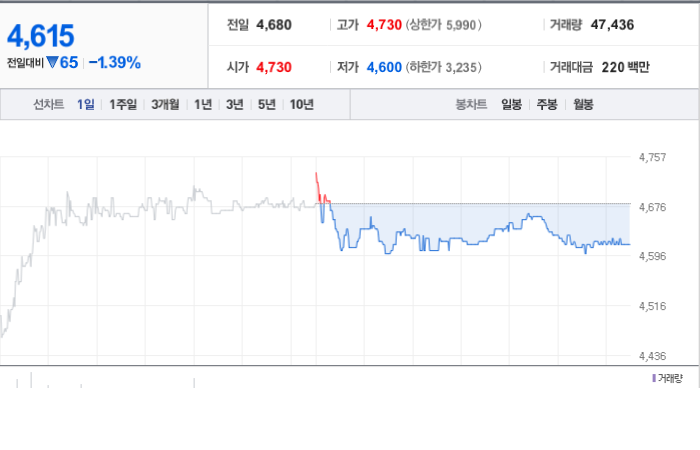삼영엠텍의 현재 주가는 4,680원이며 전일 대비 보합을 보이고 있습니다. 주주현황을 살펴보면 전창옥(외 6인)이 지분 16.65%를 보유하고 있습니다. 삼영엠텍은 조선 기업으로 장중 주가는 4,680원이며 시가 총액은 600억 원이고 발행 주식수는 13,000,000주입니다. 외국인 보유 비중은 3.21%이며 장중 거래량은 106,642주를 기록했습니다. 매출액은 265억 원을 달성했습니다.