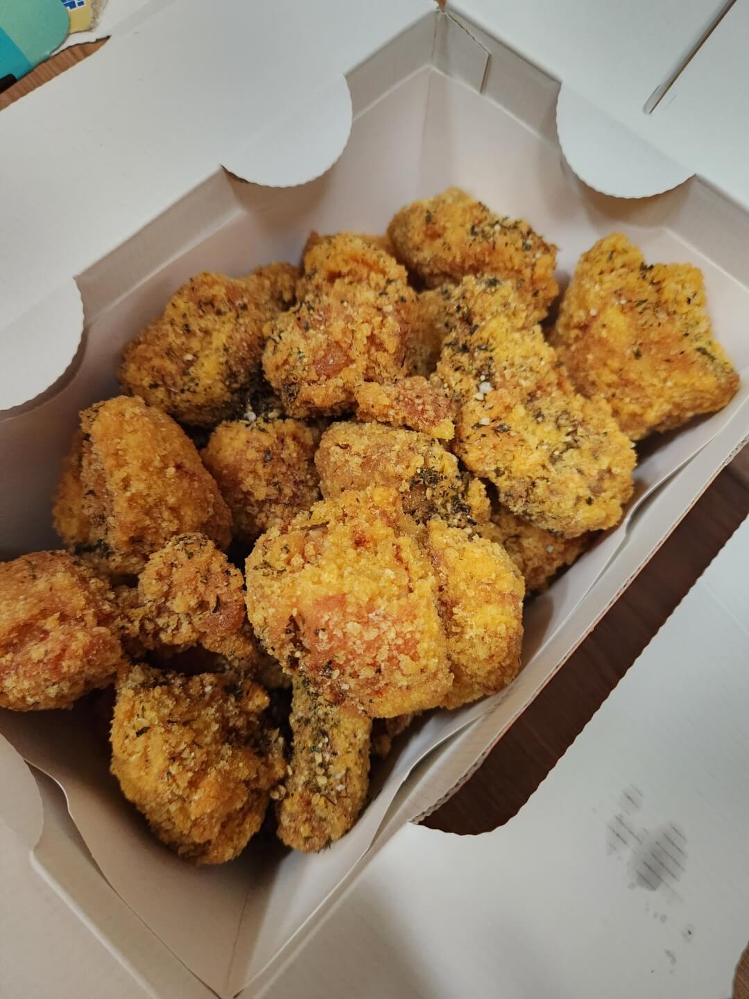 치킨의 손잡이 부분은 배달 중 혹시 모를 사고를 위해 안심 스티커가 부착되어 매장에서 집까지 안전하게 배달되는 것이 특징입니다. 또한 60계 치킨의 특성상 한 마리 치킨을 작은 부위로 세분화하여 튀겼기에 더욱 양이 많은 것처럼 느낄 수 있는데요. 실제로 여자 둘이서 먹어보니 정말 양이 많아 가히 놀라지 않을 수 없었습니다. 치킨은 정말 저세상 수준의 바삭함이 느껴져서 너무 만족스러웠습니다. 평소 후라이드는 바삭해야 한다는 신념으로 치킨을 대해왔는데요. 60계에서 기존에 출시한 치킨들과는 달리 바삭함이 강조되는 제품이라 더욱 맛있게 먹었습니다.