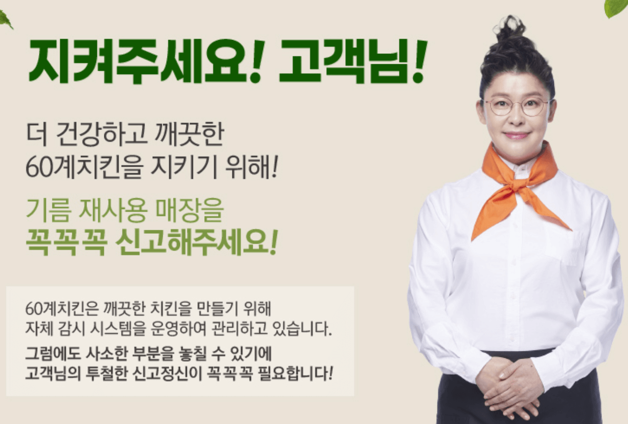 60계 치킨의 원래 상호인 (주) 장스 푸드에서 운영 중인 프랜차이즈 치킨집입니다. 전국 각지에 가맹점 및 직영점 을 두고 있으며, 대한민국 최초 24시간 기름 교체를 실시하였다. 특히 "그날 사용한 기름은 전량 폐기를 원칙, 매일 깨끗한 새 기름으로 60마리만 조리한다"라는 슬로건을 가지고 소비자에게 신뢰를 삼은 치킨집이라는 것이 큰 특징입니다. 최근에는 가파른 성장세를 보여 전국에 2019년 12월 기준으로 883개의 매장수를 보유하며 대표 브랜드로 거듭날 준비를 하고 있습니다.