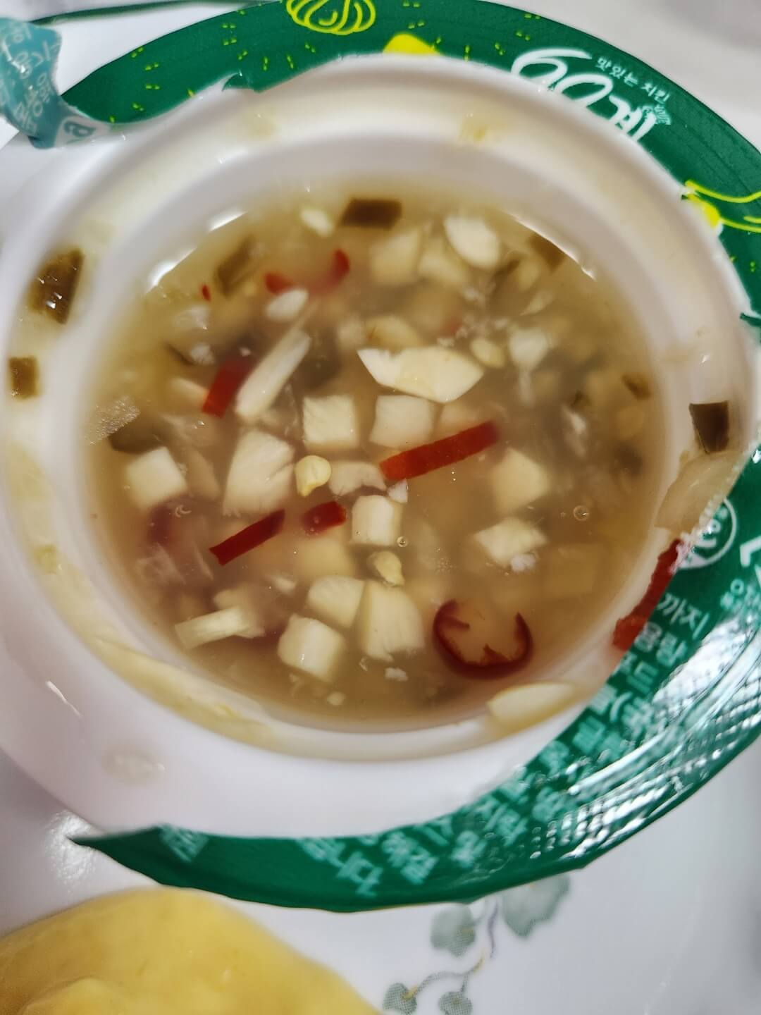 치킨 한 마리에 대한 구성은 다음과 같습니다. 치킨, 치킨무, 콘마요소스, 크크크소스 입니다.
