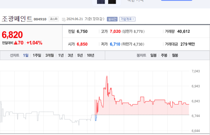 동사는 1967년 설립되어 주요 사업으로 각종 도료의 제조 및 판매를 한다. 1976년에는 상장을 하였으며, 현재는 일반용 도료 및 관련 제품을 전문으로 하는 회사이다. 또한, 전기전자재료 및 점/접착제 사업부문의 성장성을 고려하여 계속해서 투자를 진행하고 있다. Chokwang Vina Co.,Ltd.와 씨케이이엠솔루션 등을 비롯한 연결대상의 종속회사를 보유하고 있다. 2024년 3월에는 전년대비 매출액이 3.9% 감소하였지만, 영업손실은 29.2% 감소하여 당기순이익이 흑자로 전환되었다. 이는 원유 가격 하락으로 인해 용제류의 가격이 하락하고, 수지 및 모노머류의 공급가격이 하락하여 매출원가율이 감소했기 때문이다. 앞으로는 고부가가치의 비도료 사업분야로 사업영역을 확대해가며 장기적인 성장을 이루어 나갈 계획이다.