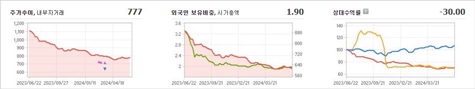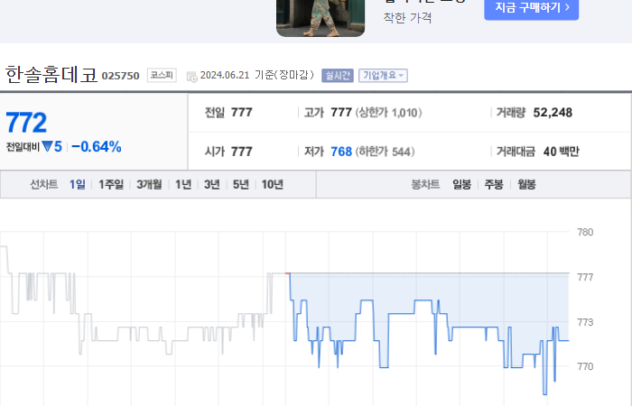 한솔홈데코의 현재 주가는 777원으로, 전일 대비 -2원 하락한 모습을 보이고 있습니다. 주주 구성을 살펴보면 한솔홀딩스(외 3인)가 지분의 23.66%를 보유하고 있습니다. 종이 및 목재 기업인 한솔홈데코는 시가 총액이 622억 원이며 발행 주식수는 80,565,149주입니다. 외국인 보유 비중은 1.90%이며, 장중 거래량은 37,097주를 기록했습니다. 또한, 매출액은 811억 원을 기록했습니다.